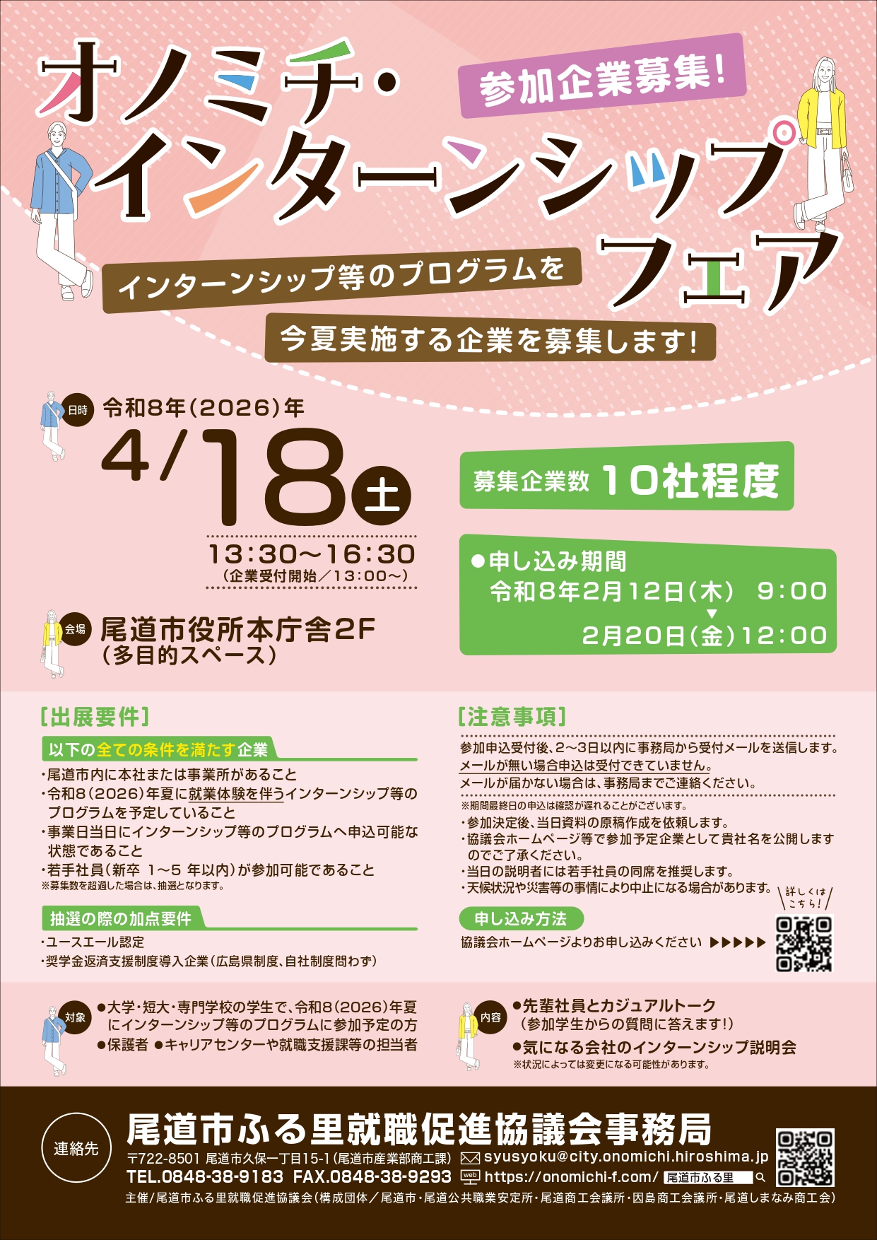令和8(2026)年夏に、就業体験を伴うインターンシップ等のプログラムを予定している尾道市内企業(10社程度)を募集します。学生・保護者・学校の担当者等と交流しながら、カジュアルトークや説明会を通じて貴社の魅力とインターンシップのプログラム内容を直接発信できる機会です。ぜひお申し込みください。